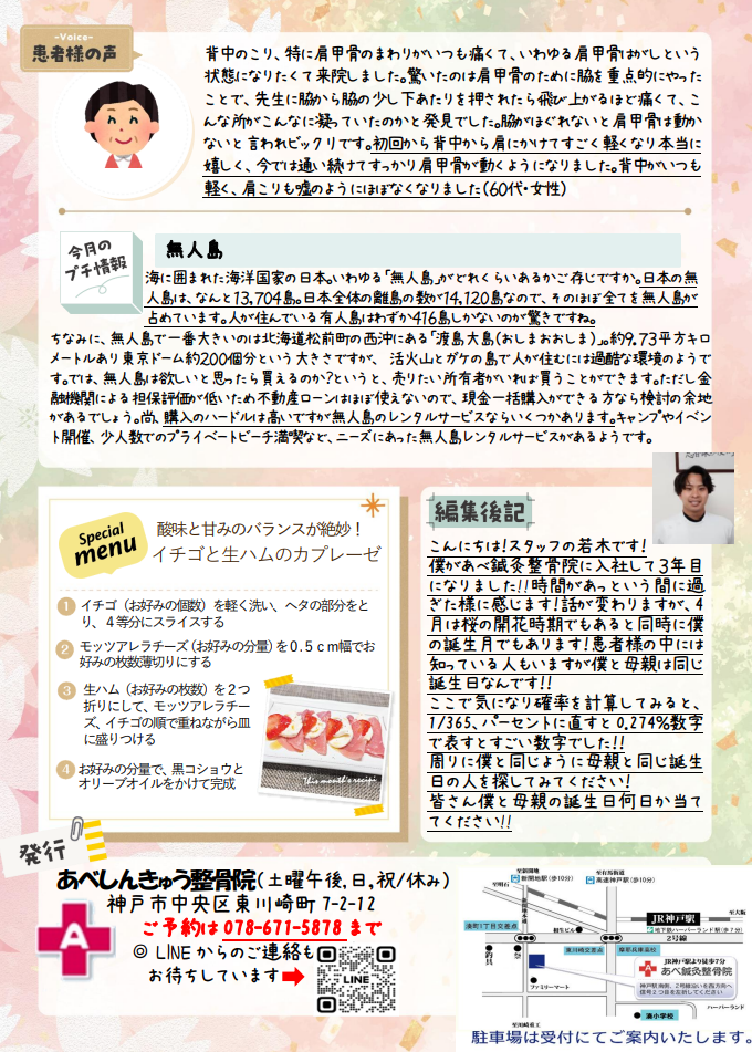 こんにちは!スタッフの若木です! 僕があべ鍼灸整骨院に入社して3年目になりました!!時間があっという間に過ぎた様に感じます!話が変わりますが、4 月は桜の開花時期でもあると同時に僕の誕生月でもあります!患者様の中には知っている人もいますが僕と母親は同じ誕生日なんです!!