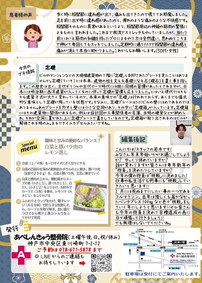 ※予約は、当院ホームページをご覧ください。■あべ鍼灸整骨院 神戸市中央区東川崎町7-2-12 日三ビル1F <営業時間>午前 8:30~12:30・午後16:00~19:30・水曜日は午前8:30~11:30・午後17:00~19:30・土曜日は8:30~12:30 ※交通事故対応致します。 <定休日>日曜日・祝日・土曜日午後