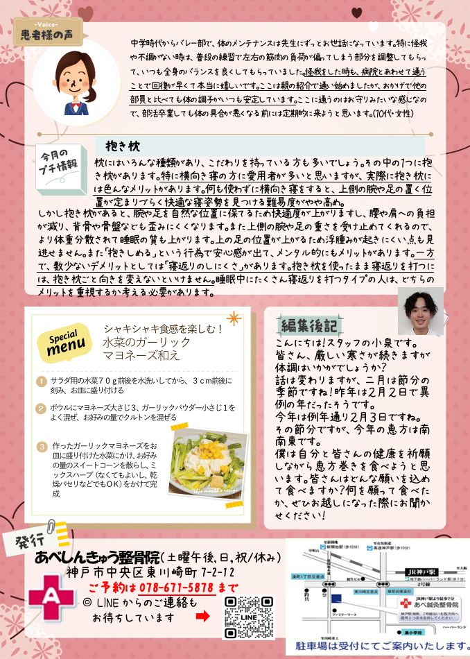 2月のニュースレター配信 | あべ鍼灸整骨院 | 神戸市・神戸駅・東川崎町